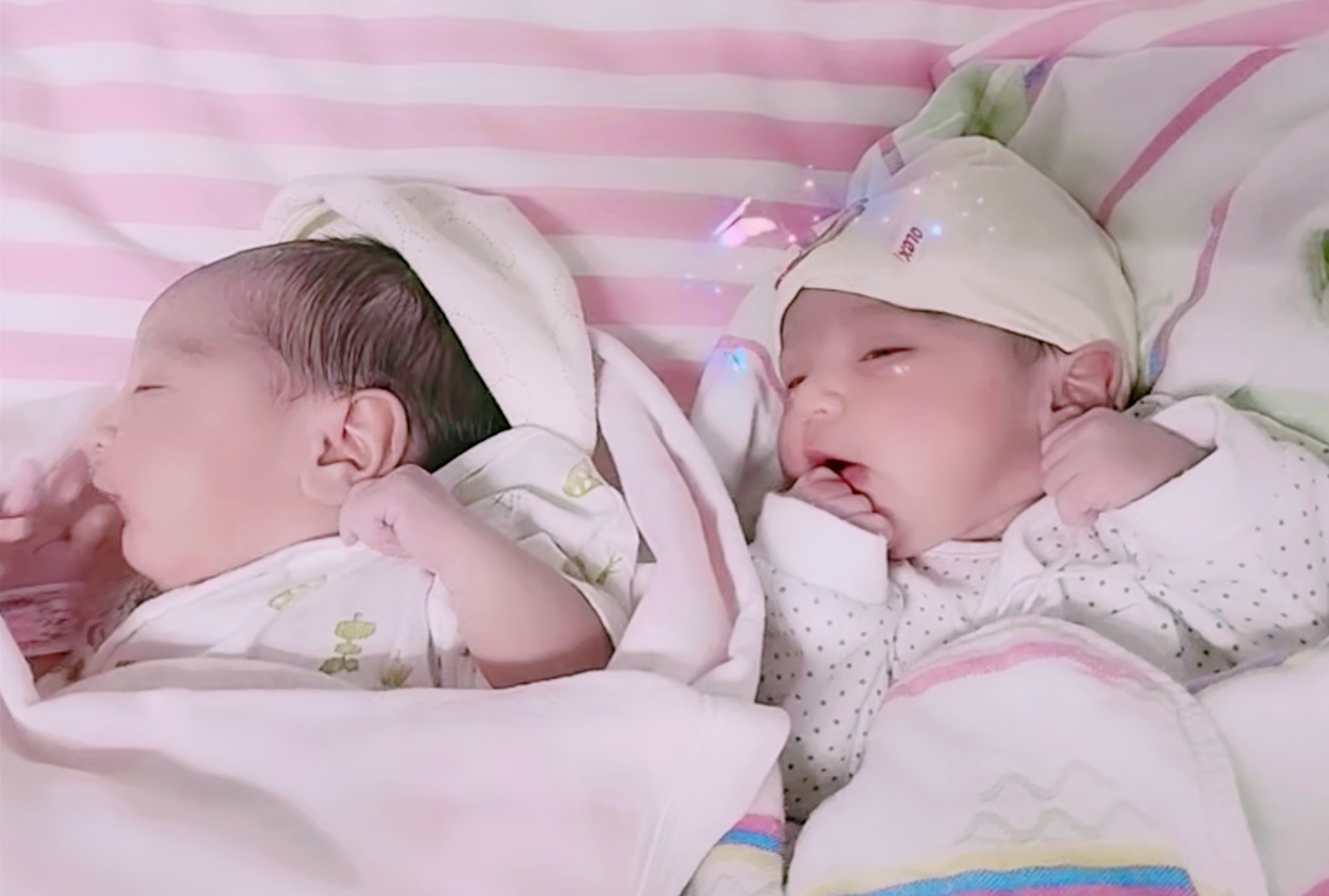 在医护人员严谨有序,共同的努力下,中午12点16分,随着一声清脆的婴儿啼哭声,一个可爱的女婴顺利出生,4分钟后,她的妹妹同样用清亮的啼哭声宣告自己的降临,两个宝贝体重分别是:2790g和2855g,产程非常顺利,母女平安。