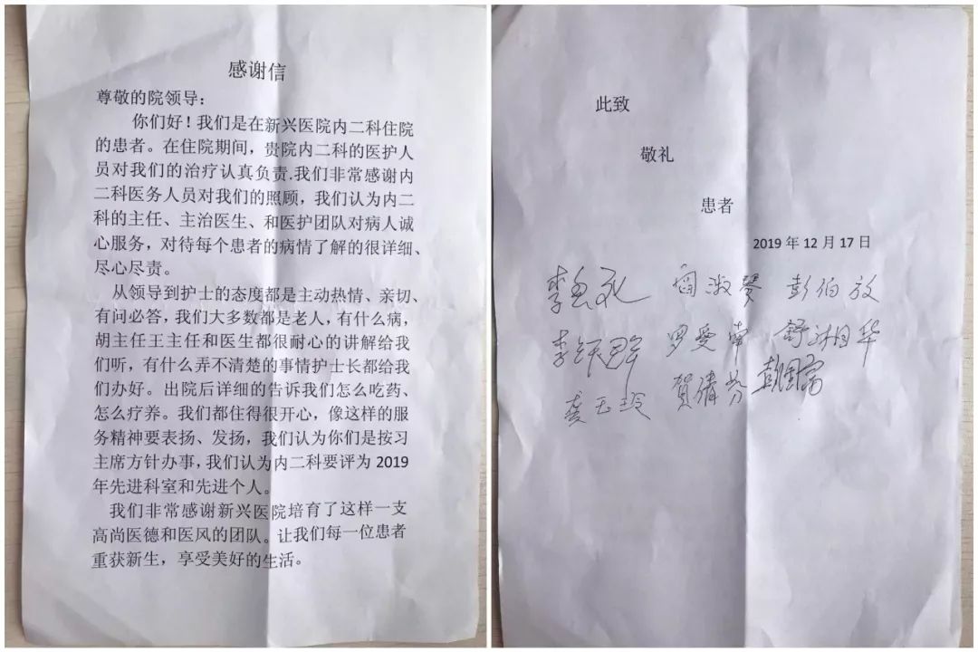 近日,新兴医院内二科(内分泌·糖尿病科)医护人员收到了一封沉甸甸的感谢信,说它沉甸,是因为它饱含着9位住院患者对内二科医护人员的感谢之情。