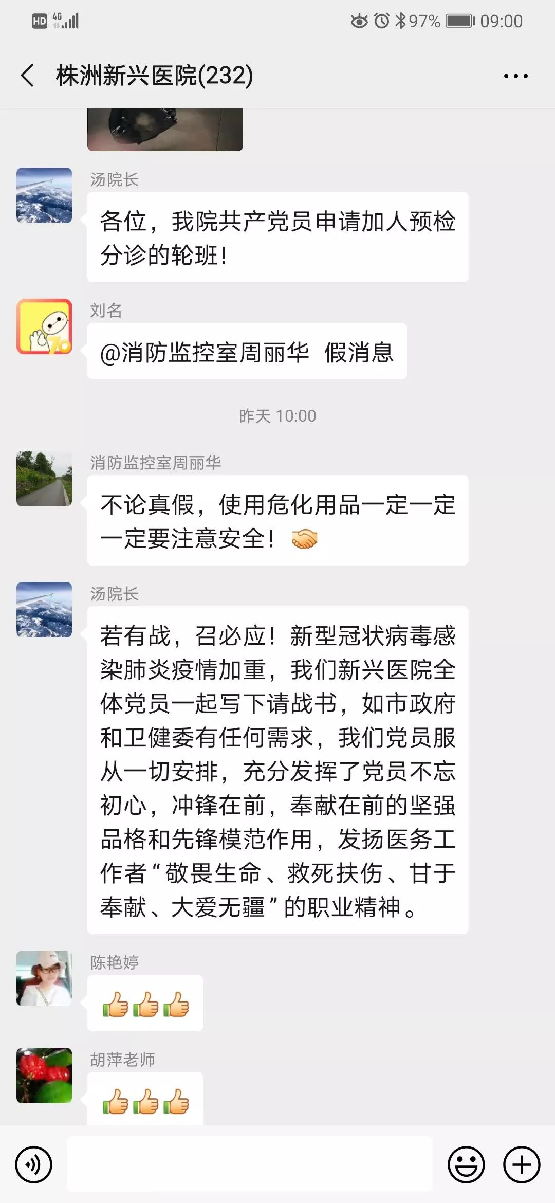 目前,我院首批志愿者名单已向株洲市卫健委报备,随时听命全力以赴支援前线。
