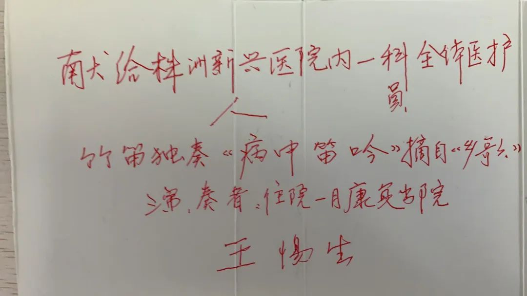 走进病房一看,原来吹奏笛子的是今年63岁的王叔,据了解,王叔是一名资深的笛乐爱好者,从6岁开始学笛,参加过各种乐器比赛,曾是株洲市竹笛协会常务会长,数十年来,王叔每天笛不离手,没事的时候就喜欢吹上一曲,笛乐已成为他生活中不可分割的一部分。