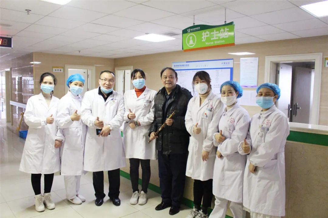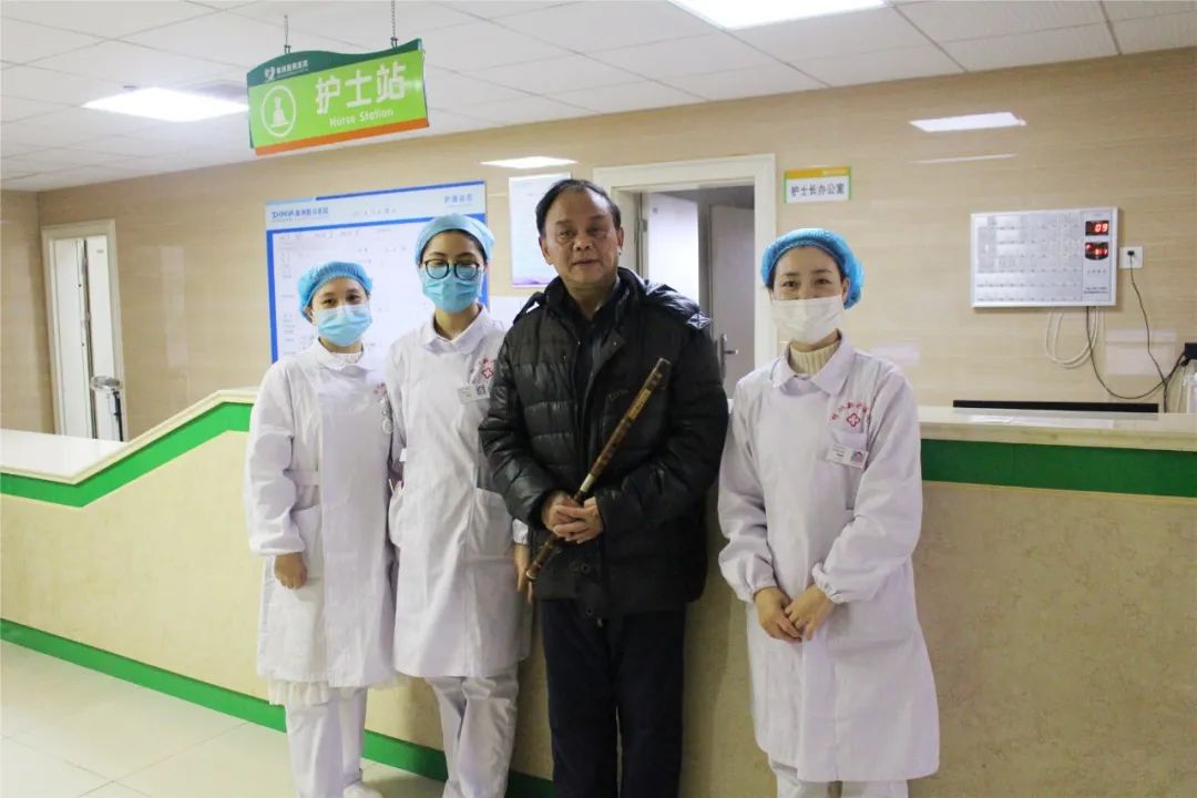3月18日上午,爱笛子如生命的王叔在临出院之际,想用笛声来表达对内一科医护人员的感谢,他说,“为什么采用吹笛这种方式来感谢医护人员,是因为我来的时候是不能吹笛的,我来的时候是一口痰一口血,气喘吁吁,想都不敢想吹笛子,在内一科所有医护人员对我的悉心医治和护理下,我的病情恢复的非常快,在离开医院之前,想用我力所能及的方式对内一科的医生护士表示感谢,同时也希望通过笛乐来影响到其它病人,一起笑对生活,树立信心,战胜病魔,早日康复”。