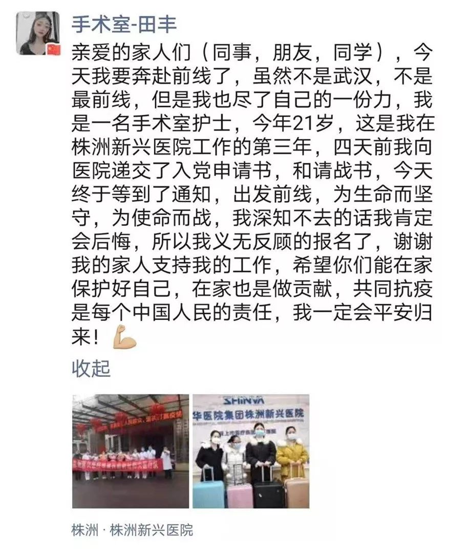 田丰是手术室的一名护士,工作耐心细致,表现出色,她是本次队伍中年龄最小的一位,99年出生的她,从疫情发生的那一刻,就做好了上一线的准备,在党支部发出召令之后,她第一时间递交了入党申请,并自愿加入抗击疫情志愿者队伍,昨日接到指令的她很激动,她说:家里人很担心我,但他们更加支持我的工作,临出发前,她发一条朋友圈,小女孩在疫情面前有着前所未有的坚定。