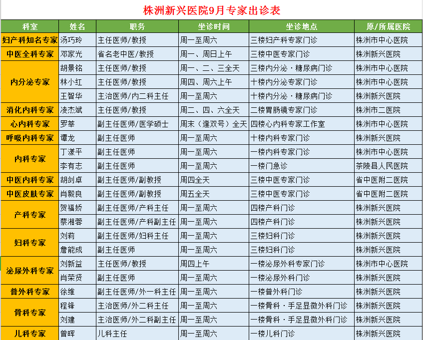 株洲新兴医院九月特聘专家坐诊表,请查收!